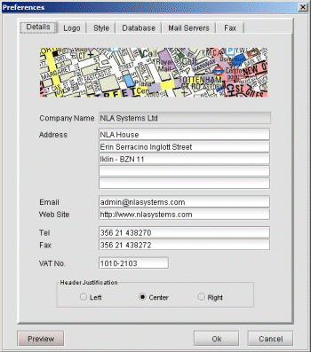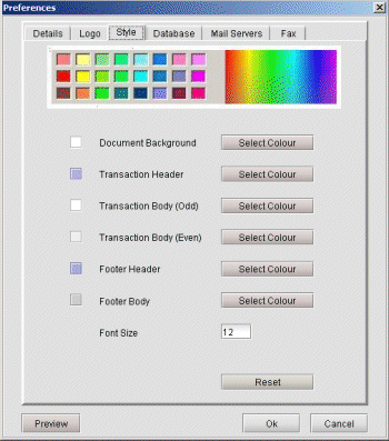 The 'Preferences' function is found under the 'Edit' menu bar item and enables you to customize the statement document to your taste and to assign user-defined settings. These settings are divided into six tabs, namely Details, Logo, Colors, Database, Mail Server and Fax. At any point during this procedure, you can see how the final document will appear by pressing the 'Preview' button.