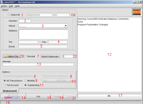 Click the cyberPOST button (14) to email out statements according to what you have defined in 'Options' described above. If for example you have checked the 'Select All Accounts' checkbox and left unchecked 'Include Negative Balances' and 'Include Zero Balances' checkboxes, cyberPOST starts to email all statements while skipping those accounts with a zero or negative balance. Any text that you have entered in the 'Statement Message' field will appear as a message to your clients at the bottom of each statement. Any time while statements are being emailed, you can pause the process and resume it by toggling the 'Pause/Resume' button (16). Alternatively, you can access this function through the menu bar by clicking 'Action' -----> 'cyberPOST' or else, directly by pressing Control-C.