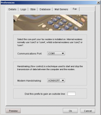 If your fax modem is connected to a PABX and you need to dial a prefix to get an outside line, enter this prefix in the field provided and make sure you add a comma as a suffix. This signals your modem to pause for a second or so.